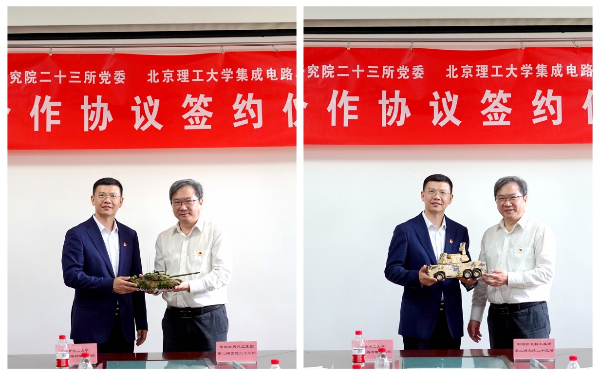集成电路与电子学党委书记武楠、航天二院二十三所党委书记张志衡互相赠送了纪念品。