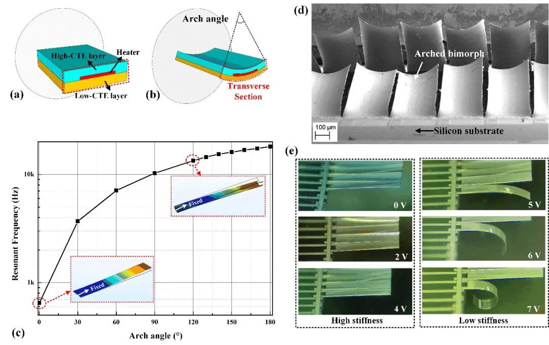 (a)电热式bimorph概念图;(b)具有圆心角的电热式bimorph概念;(c)Bimorph圆心角和谐振频率关系;(d)刚度增强bimorph器件的SEM图;(e)器件形变与施加电压的关系。