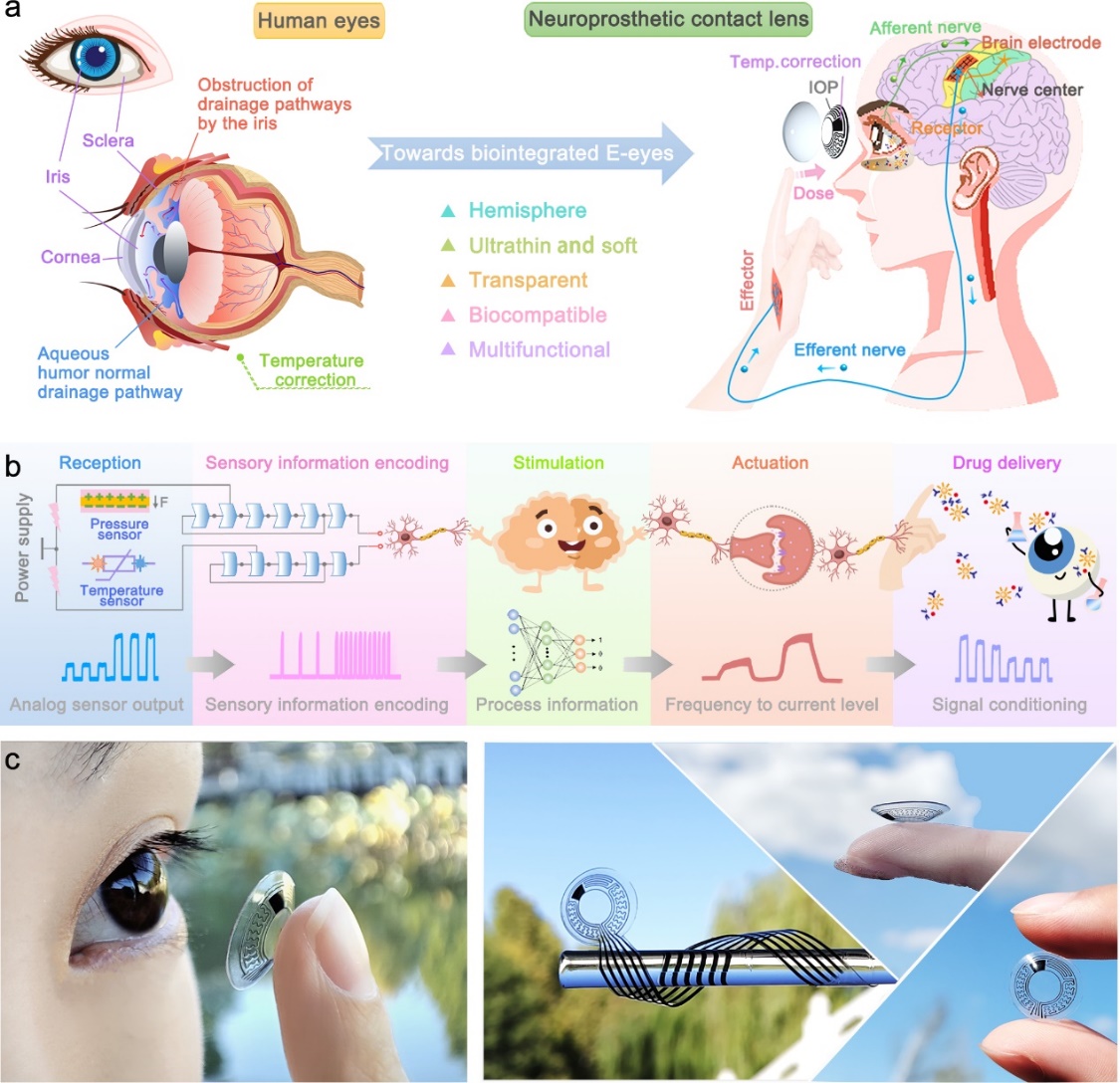 近日,小说h 小说h 柔性电子器件与智造研究所在《Nature Communications》上发表题为“Neuroprosthetic contact lens enabled sensorimotor system for point-of-care monitoring and feedback of intraocular pressure”的学术论文。论文报道了一种用于眼压即时监测和感觉反馈的神经形态隐形眼镜(Ti3C2Tx-NCL),实现了眼压信号的实时有效监测,加强了眼睛和大脑之间的神经传递,建立了眼部信号异常的躯体感觉反馈,在柔性健康监测领域显示出独特的优势。小说h 为唯一通讯单位,博士研究生刘伟佳为论文的第一作者,李腊副教授和沈国震教授为通讯作者。