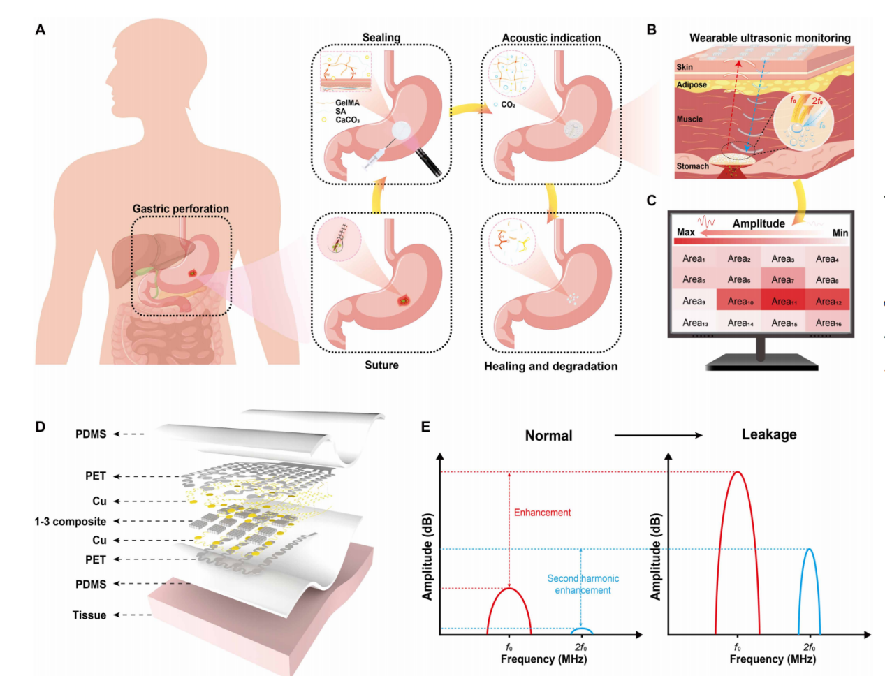 近日,小说h 小说h 柔性电子器件与智造研究所沈国震教授团队在国际知名期刊《Science Advances》上发表题为“Bioresorbable acoustic patch for simultaneous sealing and early detection of gastric leakage”的研究论文。该研究首次将酸响应声学水凝胶与可穿戴柔性超声阵列相结合,实现了术后吻合口漏的无线、无创、持续监测与主动封堵,为胃外科术后管理提供了全新范式。