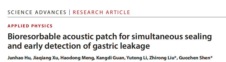 论文详情:Junhao Hu, Jiaqiang Xu, Haodong Meng, Kangdi Guan, Yutong Li, Zhirong Liu* and Guozhen Shen*. Bioresorbable acoustic patch for simultaneous sealing and early detection of gastric leakage. Science Advances, 2026, 12(16), aec6857. DOI:10.1126/sciadv.aec6857