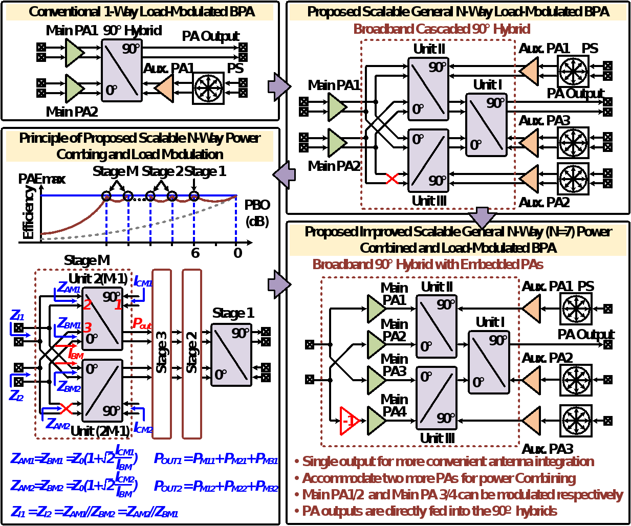 架构层面,在引入多级正交混合网络来增加辅路功放数量的基础上,团队创新性地提出将主路功放的位置挪移至多级正交混合网络前直接连接,形成功放嵌入型宽带正交混合网络,显著改善了架构的简洁性、电路性能和设计优化效率。