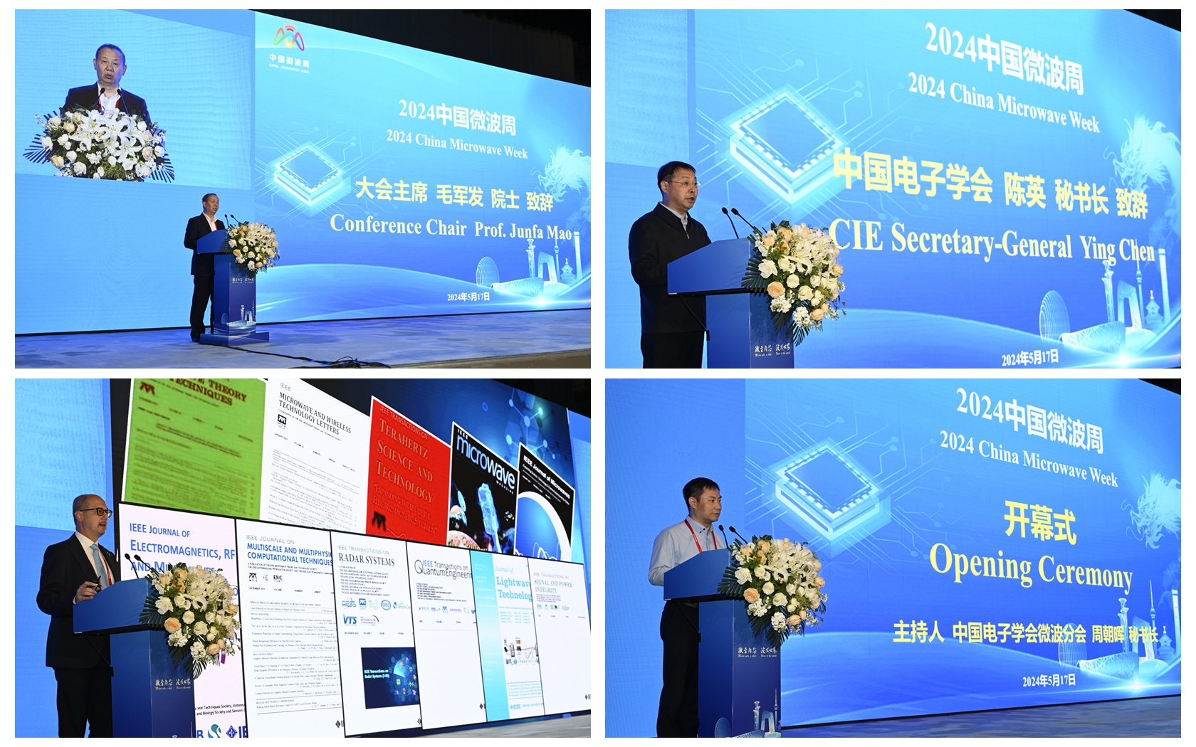 2024中国微波周开幕式于5月17日隆重举行,大会主席、微波分会主任委员毛军发院士宣布开幕。中国电子学会秘书长陈英、IEEE MTT-S主席Maurizio Bozzi教授分别致辞。开幕式由微波分会秘书长周朝晖主持。