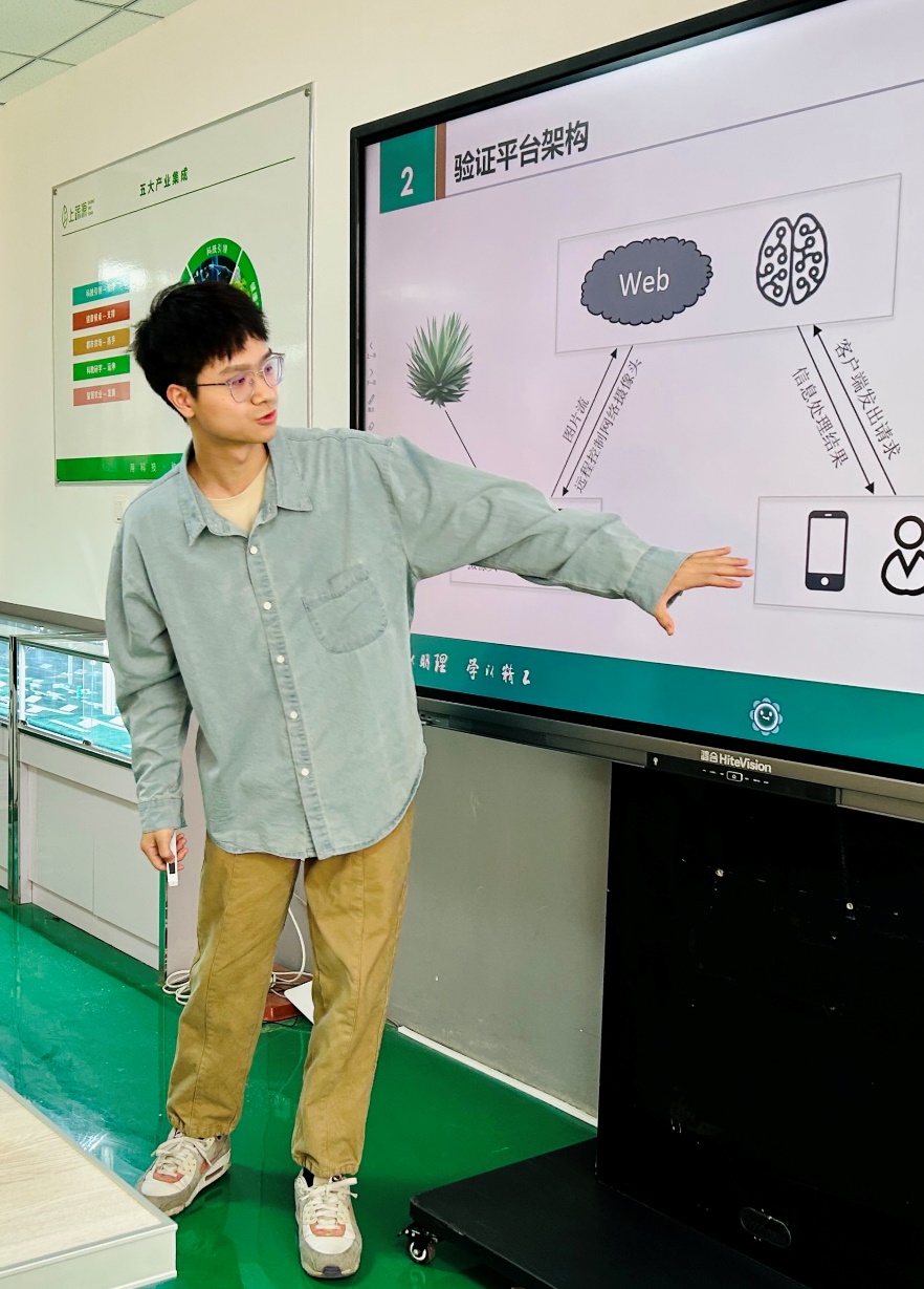 “0碳-AI赋能都市农场”技术团队负责人、学生代表陈国钊介绍了团队的技术路线,现场演示原理验证平台的运行情况,生动地呈现了技术团队的研究成果,并汇报了团队在相关竞赛和软著方面所取得的成果。