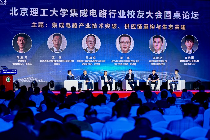 随后进行的圆桌论坛环节,由1996级本科、2000级硕士校友,众行资本创始合伙人、董事长孙达飞主持。1998级博士校友、北京理工导航控制科技股份有限公司董事长汪渤,2001级硕士校友、中国稀土集团国际贸易有限公司党委副书记、总经理王龙滨,北方华创科技集团股份有限公司执行委员会委员、副总裁夏威,1999级本科校友、睿晶半导体有限公司董事长兼总经理祁耀亮,2009级本科、2019级博士校友,北京枭龙科技有限公司董事长兼CEO史晓刚,以“集成电路产业技术突破、供应链重构与生态共建”为主题,从不同层面探讨了集成电路产业发展现状,提出了一系列富有建设性的观点与建议。